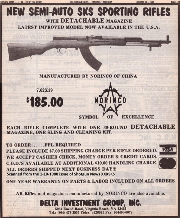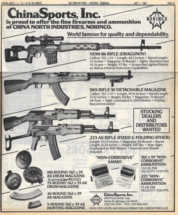 This rifle is relatively rare. China Sports Inc. Dallas, Texas only imported about 15,900 rifles. This rifle falls in the middle of the range as 09347. It was produced by Norinco (North Industry Corporation. Imports of this rifle were halted in 1989 due to talk of assault weapon bans. Later in 2003 the Bush administration sanctioned Norinco for selling weapons to Iran bringing a permanent end to all Norinco imports. This rifle is considered an assault weapon in many states so know your laws before purchasing.