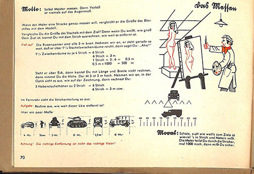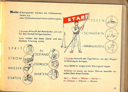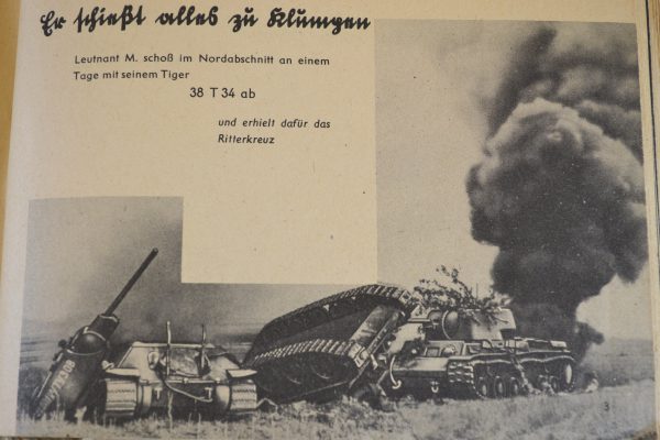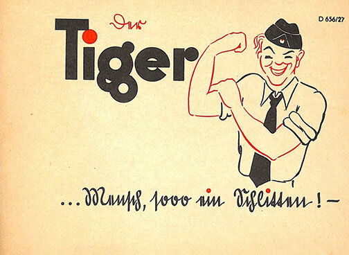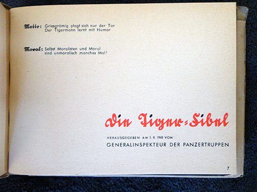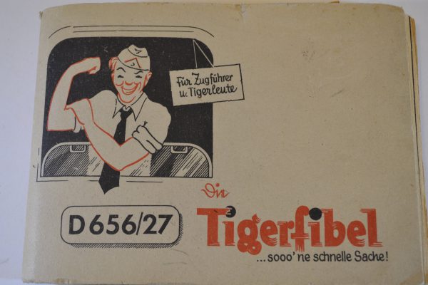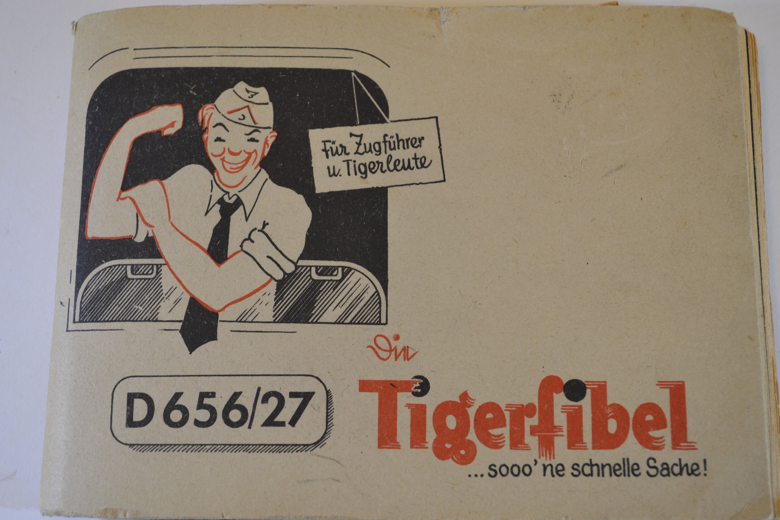 Very rare German Panzer instructional manual. The TIGERFIBEL was crew instruction manual for the German Tank, the Panzer VI Tiger heavy tank. Like other manuals designated as Fibel (basic primer), it was intended to summarize what the crew needed to know for day-to-day use of the tank. To capture their interest, it is well illustrated in comic-style and populated with drawings of a semi nude young woman while much of the text is written as poetry in a humorous manner. The Fibel is remarkably different from the typical tedious style of a German tank manuals of that period. The manual was approved by Heinz Guderian, the Inspector-General of Panzer troops. The 92 page manual has a pocket of the inside back cover containing a set of fold out supplements with photos of enemy tanks, their specifications, weak and strong points. The manual is in excellent condition and complete with all pages present and supplemental inserts included. In very uncommon excellent condition. With only 1350 Tiger I tanks produced, and nearly all of them destroyed very, very few of these survived the war. A really rare and exceptional booklet in this condition and highly desirable.